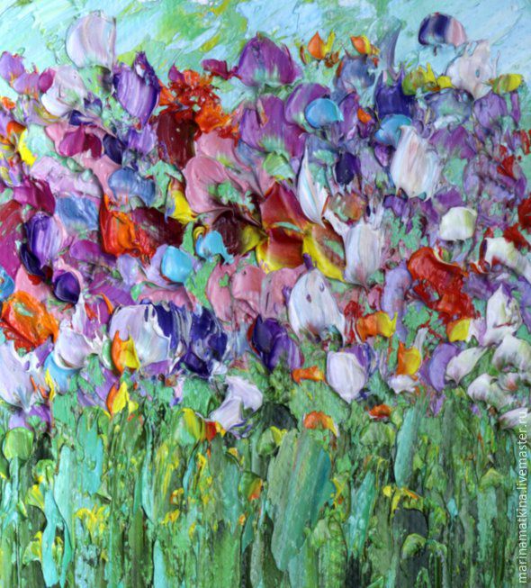 Также я уже упоминала, что мастихином можно писать не только самой лопаткой, но еще и ее острым ребром. Таким образом, создается очень красивый рельеф, а для проработки деталей вам даже не придется использовать кисть!